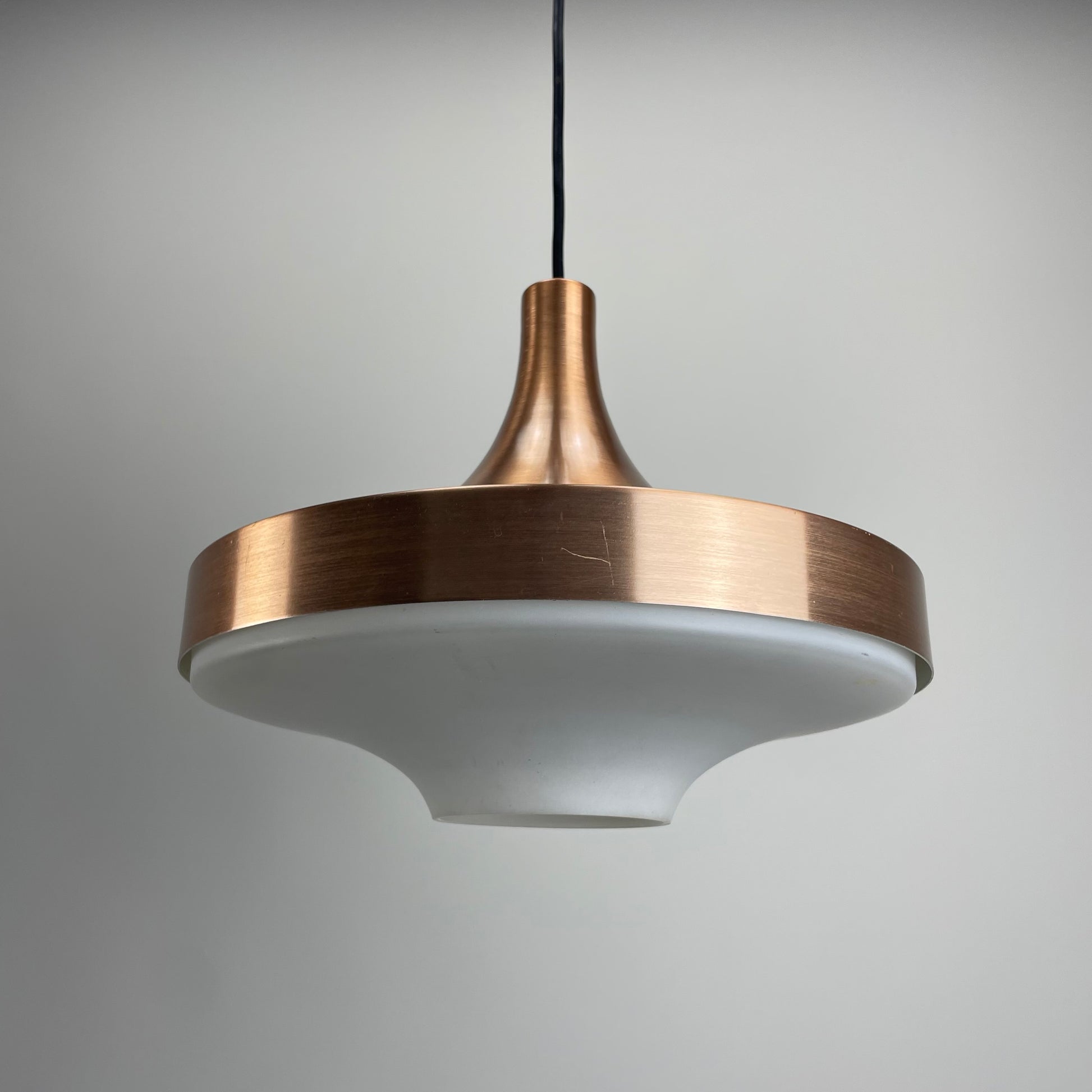 This rare UFO pendant light by Doria Leuchten from the 1960s is a stunning example of Space Age design. Featuring an iconic UFO-shaped frosted white glass shade paired with a polished copper colored aluminium holder, this pendant radiates a warm, atmospheric light that’s perfect for any modern or vintage-inspired interior. Known for its high-quality craftsmanship, Doria Leuchten created unique, forward-thinking lighting designs that continue to captivate collectors and design lovers today.
